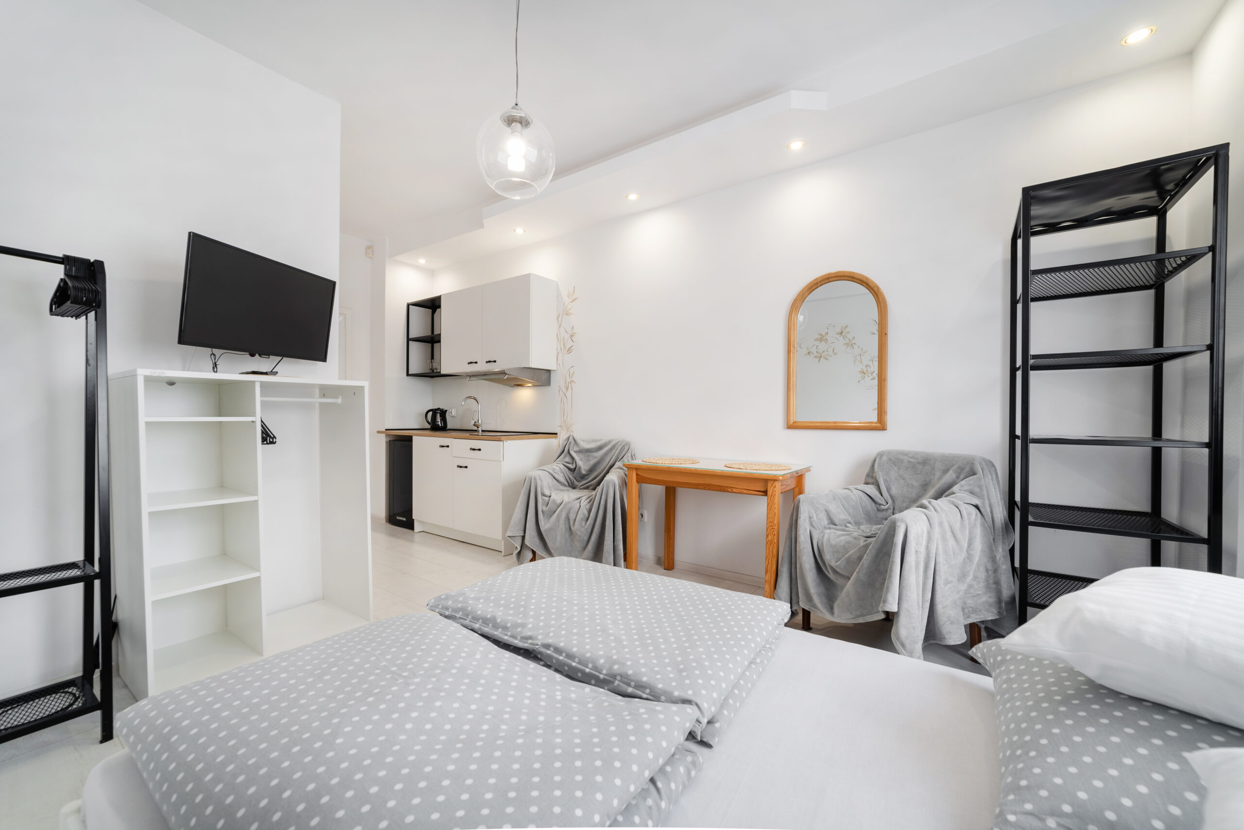 Wyposażenie (stół, krzesła, szafa, stolik i lampka nocna).
