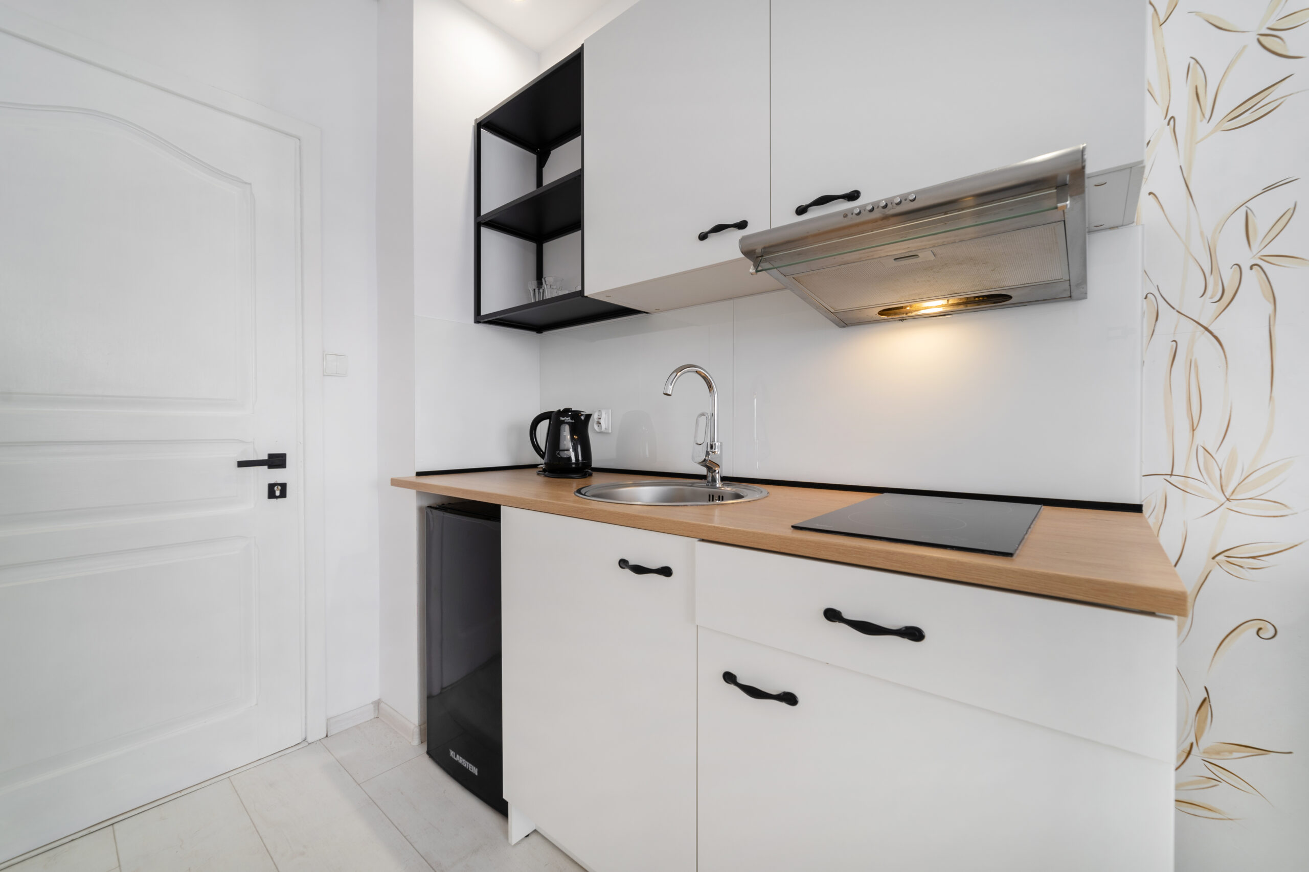 Kącik jadalny oraz aneks kuchenny (czajnik, lodówka, płyta ceramiczna, naczynia)