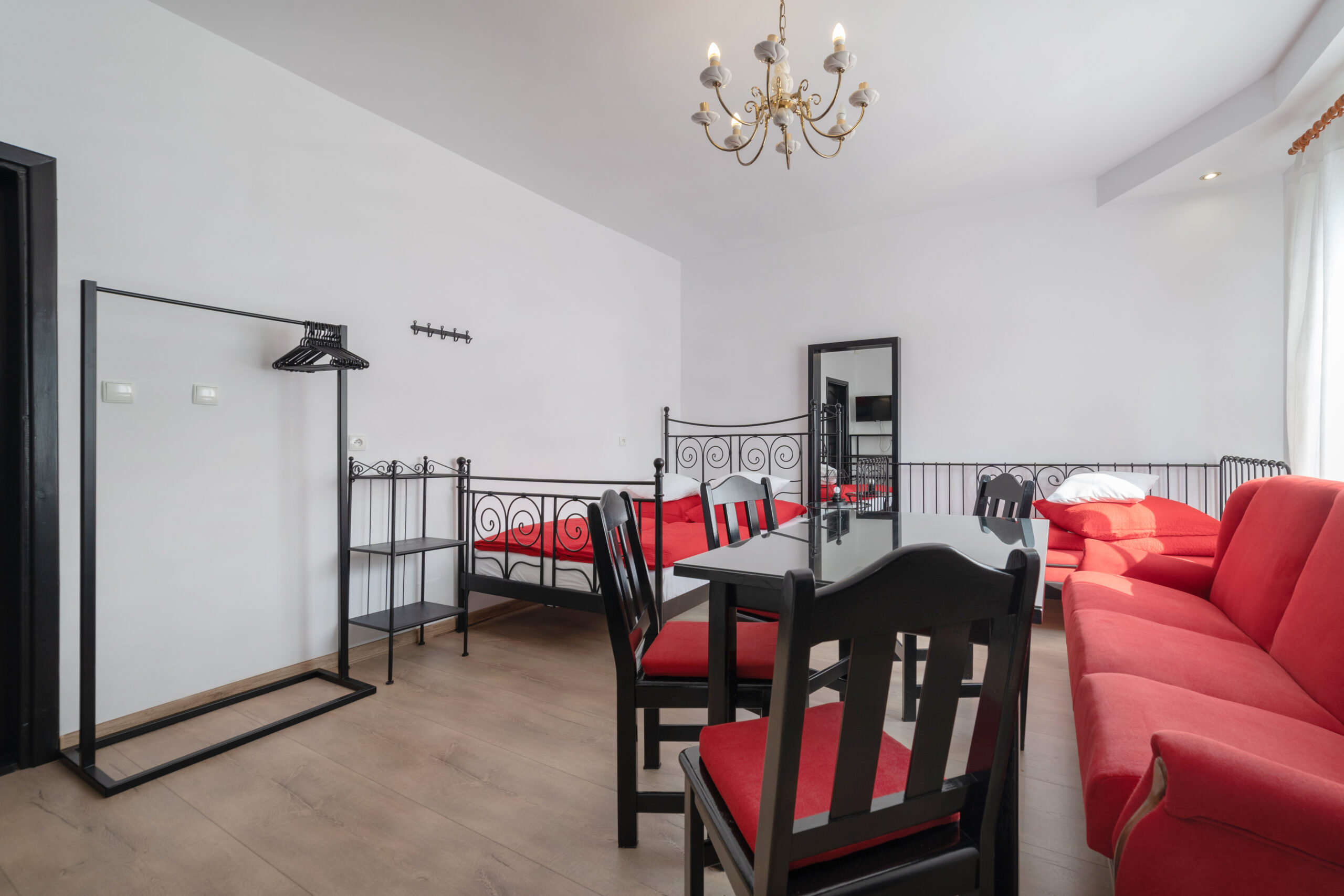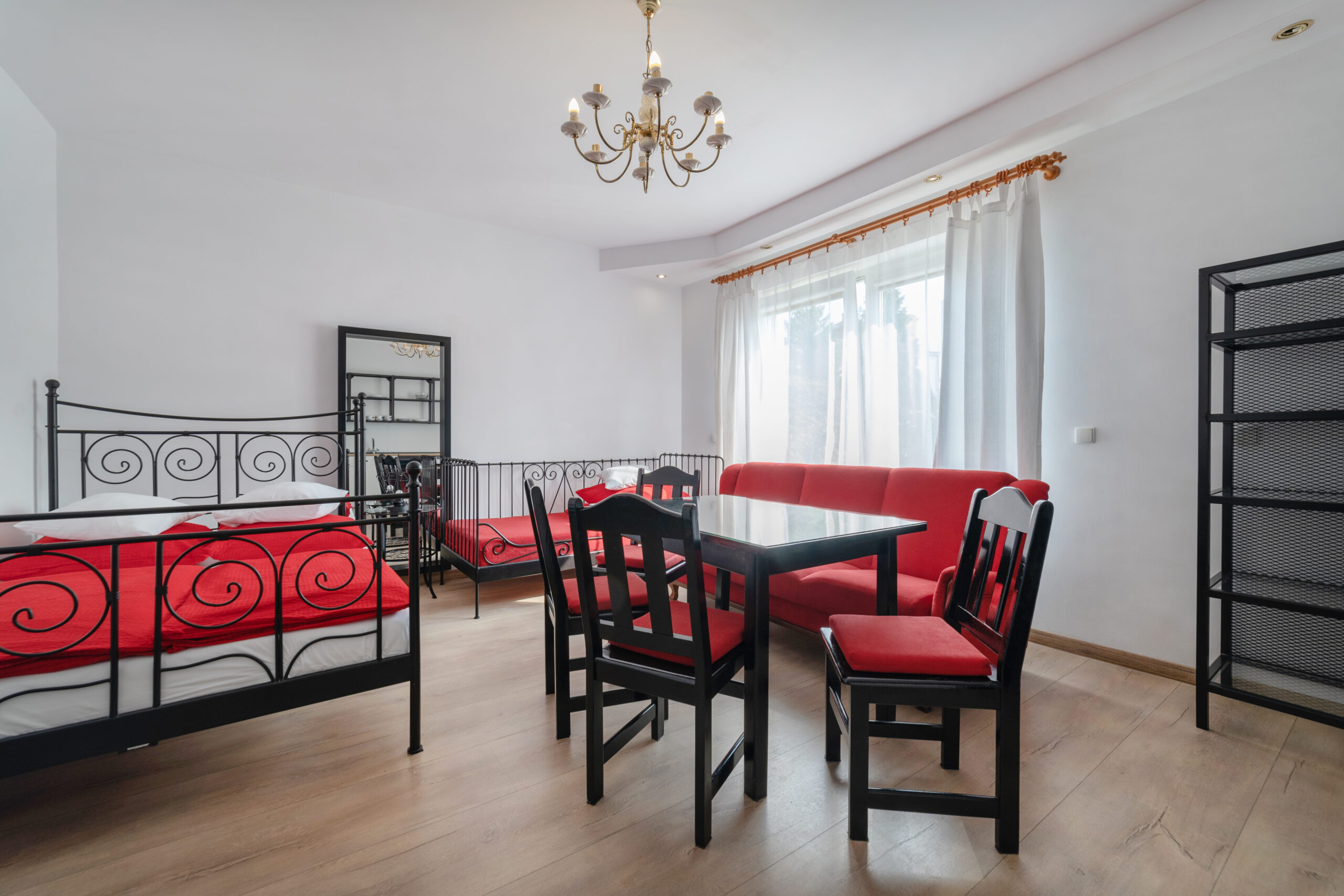 • Wyposażenie (stół, krzesła, szafa, stolik i lampka nocna).