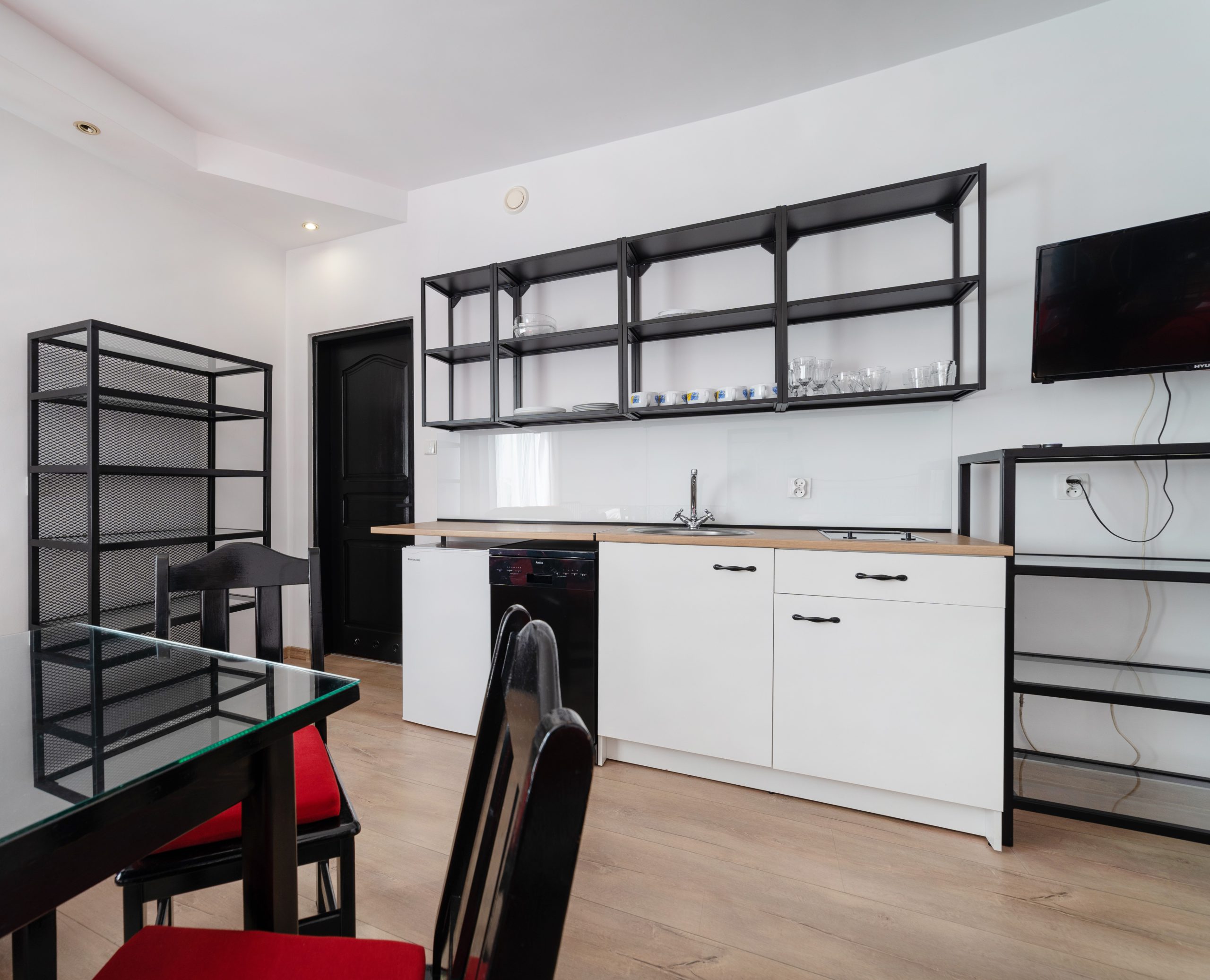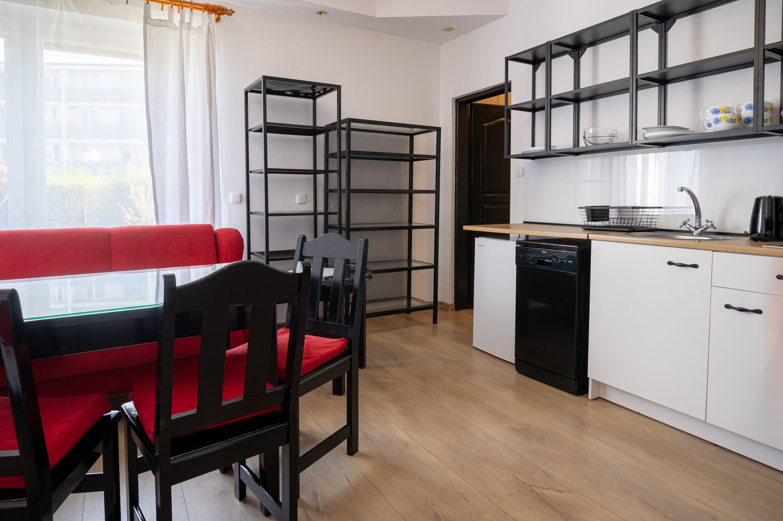 • Część jadalna oraz aneks kuchenny (czajnik, lodówka, płyta ceramiczna, zmywarka, naczynia)